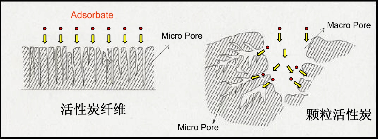 活性炭纖維是一種表面納米粒子,具有不規則的結構與納米空間混合的體系。其纖維直徑細,與被吸附物的接觸面積大,且可以均勻接觸與吸附,使吸附材料得以充分利用。效率高,且具有纖維、氈、布和紙等各種纖細的表態,孔隙直接開口在纖維表面,其吸附質到達吸附位的擴散路徑短,且本身的外表面積較內表面積高出兩個數量級。