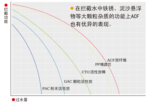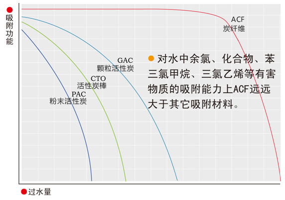 ACF(炭纖維)優異的凈水功能來源于其微孔直接開口于纖維表面,當水流經ACF濾芯時水中污染物會被微孔均勻、快速地吸附;直徑纖細的纖維狀的形態,使ACF凈水器對水濾阻降至極小,在保證壓力損失最小的情況下,讓水與材料充分接觸得以最大利用;實驗表明,ACF對水中污染物的去除能力是粒狀活性炭的10~100倍,同時增加了ACF濾芯的使用壽命,減少更換成本。