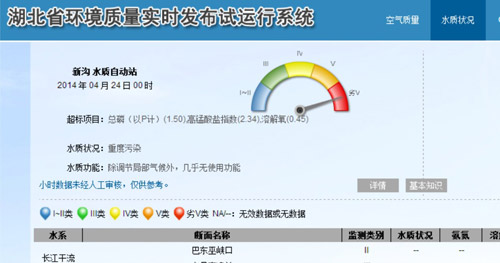 湖北省環境質量實時發布試運行系統顯示,距離余氏墩水廠上游20公里處的新溝,漢江水質狀況為劣5類(最差級別),總磷1.5,高錳酸鹽指數2.34,溶解氧0.45。不愿透露姓名專家指出,這些指數表明該江段存在嚴重的有機物污染,但因無更多資料,無法判斷到底是工業污染還是農業面源污染。