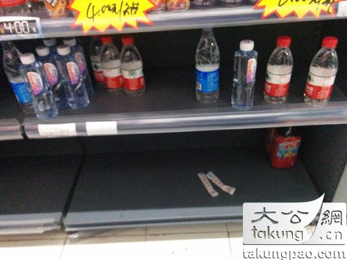 18點,龔先生下班再次來到超市。他發現貨架上只有低于500毫升的瓶裝水,大瓶的全部售罄。售貨員告訴他已從未受影響的地方調了兩箱水。