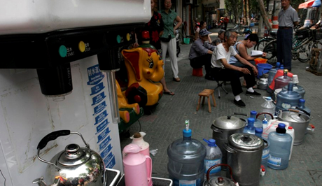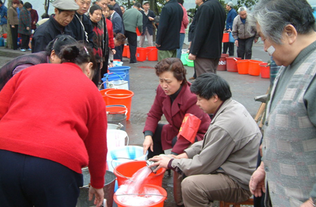 2007年5月30日,無錫市曹張新村,市民在一處凈水站排隊等待灌水。2007年5月29日晚,無錫市政府連續召開緊急會議,就市民關心的自來水水質問題進行研究,并連夜部署應急措施。各方監測數據顯示:今年入夏以來,該市區域內的太湖水位出現50年以來最低水位,加上天氣連續高溫少雨,太湖水富營養化較重,諸多因素導致藍藻提前爆發,形成自然災害,一定程度上影響了自來水水源地水質