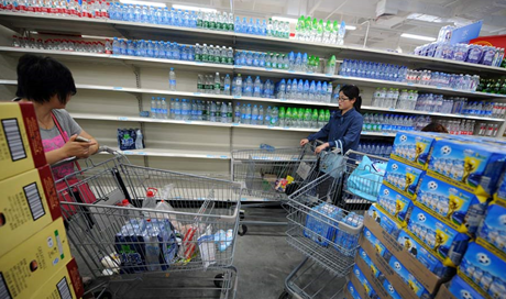 2014年5月18日中午,浙江富陽,記者來到當地的沃爾瑪超市,大批市民涌入超市急購瓶裝飲用水,大批貨柜上的礦泉水被搶購一空。富陽市人民政府今日發布通告,稱7時接杭州市環保局和桐廬縣環保局通報,桐廬縣發生運輸車側翻泄漏事故,部分四氯乙烷泄漏至富春江。富陽市政府決定,富春江沿線各取水單位暫停從富春江取水,從12時起暫停自來水供應。