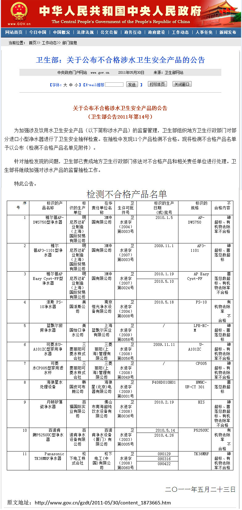 得知國家衛(wèi)生部公布的凈水器產品抽樣檢驗結果,我公司十分重視,衛(wèi)生部此次檢查中,我公司型號為PS-10批次為2010.5.18的進口凈水器在功能性加標(即有機化合物)實驗最后階段出現指標下滑(安全性試驗和微生物加標均合格,特別是砷及菌落檢測均合格),我公司立即開始自查并早已通知封存同批次產品,此批次產品只在沈陽地區(qū)銷售,銷售日期為2010年6月25日至2010年9月5日。確認未能達標的原因為:該批次產品在運輸和存儲過程中,主機濾芯存放不當;我公司對由此給消費者帶來的困擾表示誠摯的歉意,同時采取以下相關措施: