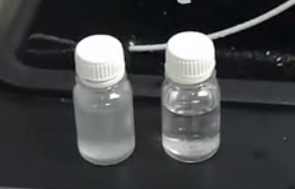 SSP實驗小瓶的對比照片,左側自來水(渾濁),右側SSP過濾后(清澈)